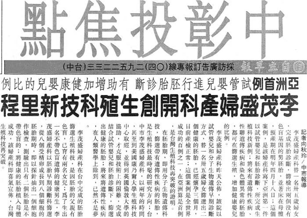 - 亞洲首例進行胚胎診斷案例協助遺傳疾病家族篩除基因問題的胚胎
