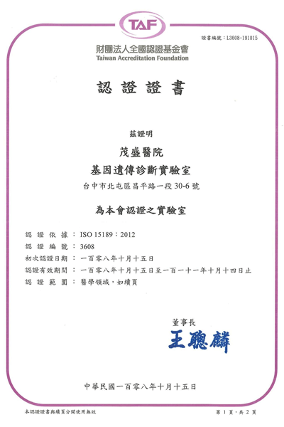 - 茂盛基因遺傳診斷實驗室通過 ISO15189 認證證書
