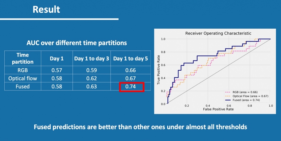 這篇研究論文為2018/4-2019/4進行的回溯性研究,採用茂盛醫院這一年來在臨床上共計690位年齡在38歲以下健康婦女的資料庫,將其PGT-A及Timelapse Videos資料匯入本院AI人工智能系統的Deep Learning,經反覆交叉測試而建立的預測模型,能分辨出胚胎染色體狀態的好壞。經統計學方法(AUC)運算之後顯示(註3),利用第1天至5天胚胎影像與融合演算法的預測效能勝過其他的組別(圖一);另經盒狀圖分析結果顯示,融合演算法可較明顯區分異常胚胎與非異常胚胎(圖二)。